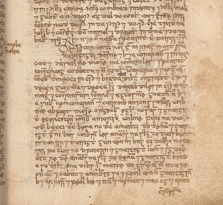 This paper manuscript of 23 folios, which was recently digitised by the British Library for the LEIGHEAS project, was written near the end of the sixteenth century. Its cataloguer, Standish Hayes O’Grady (1926: 280), noted that the texts were well written in several hands and that ‘The language is altogether modern; orthography good, but with occasional reproduction of local pronunciation.’ The main scribe was Tadhg Mac Caisín, who wrote a note on fol. 2v observing that he had finished writing some definitions drawn from Bernard of Gordon’s Lilium medicinae while in Thomastown (a mbaile Tumáis) on the 28th of July 1592. O’Grady suggested that the location in question may have been Thomastown, Co. Kilkenny. Tadhg Mac Caisín belonged to a hereditary medical family that is known to have been practising since at least the early fifteenth century and had apparently been unsuccessful in contesting the post of official physician to the Mac Giolla Phádraig dynasty in Ossory a century later (Nic Dhonnchadha 2006: 13 and 35–6). Another Irish medical manuscript (Dublin, National Library of Ireland MS G 453) was written for Tadhg in the same year as Egerton 159 (Ní Shéaghdha 1987: 38). One of the anonymous scribes who contributed to Egerton 159 may have been Tadhg’s student, as he wrote on fol. 7r that he had completed the preceding text for him on the 30th of January 1592, and that his father William had dictated it to him (O’Grady 1926: 282).